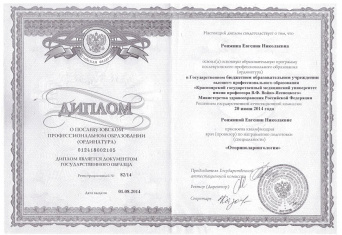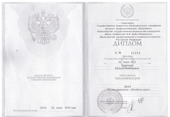 Высшее медицинское образование, Красноярский государственный медицинский университет имени профессора Войно-Ясенецкого, 2012, специальность «Лечебное дело»